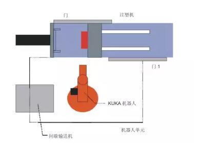 機器人的任務是將塑料制品從一臺注塑機中取出。制品用真空吸盤吸住,再堆放到注塑機旁的一臺間歇輸送機上
