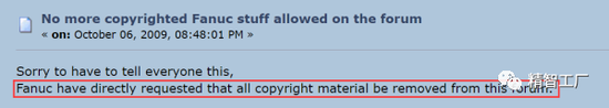 在2009年,發(fā)那科通知著名的工業(yè)機(jī)器人論壇Robotforum Support for Robotprogrammer and Users - Index刪除其網(wǎng)站上所有網(wǎng)友分享的發(fā)那科機(jī)器人的隨機(jī)文檔和技術(shù)資料,有理由相信其他的討論平臺(tái)同樣收到了類似的通知: